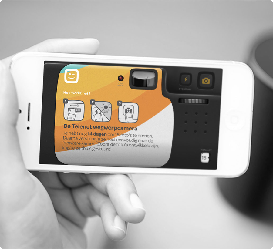 TheseDays approached us with the idea for creating an app that acts exactly like an old throw-away camera. You use the app to take a maximum of 15 pictures. You can only see your subject through a small view finder and can not see any of your pictures until they are ‘developed’, just like old times. After filling in a form, Telenet sends the printed pictures to the user’s home address.